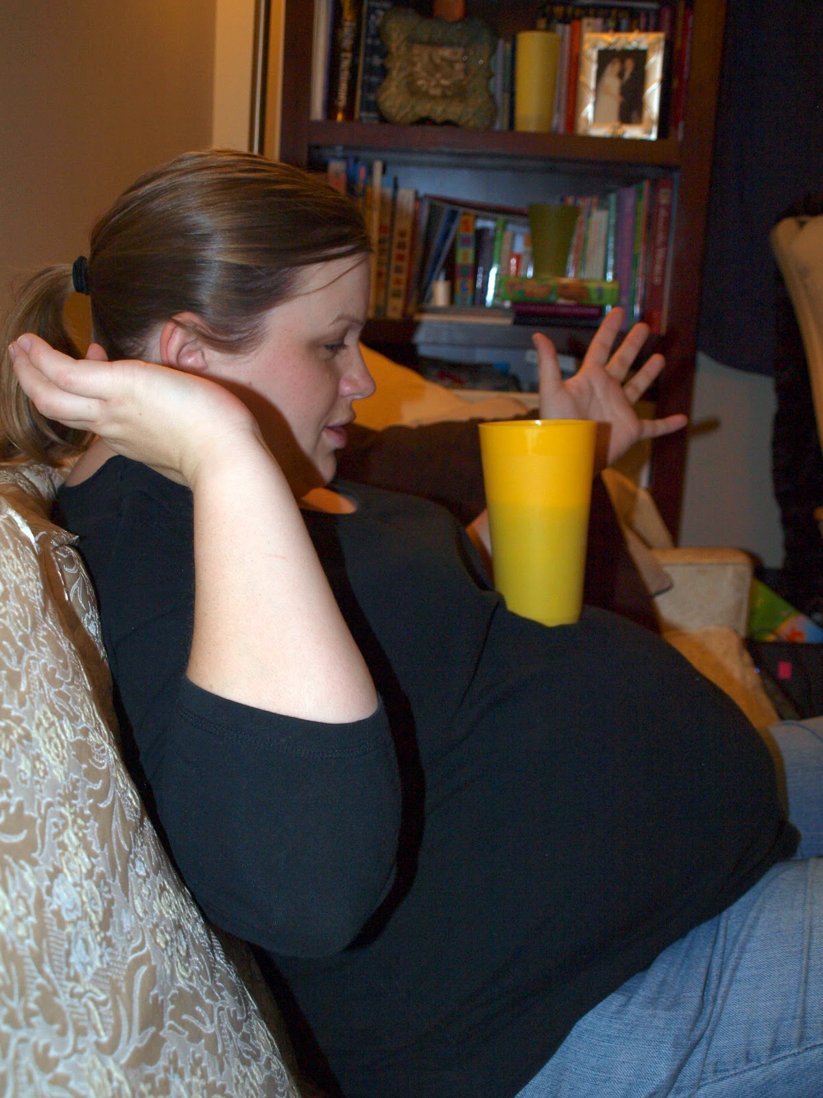 first: be anywhere from 38-40 weeks pregnant. or, if that's impossible for you, strap a 40 pound bag of flour to your tummy, making sure it's impossible for you to bend and touch your toes.
